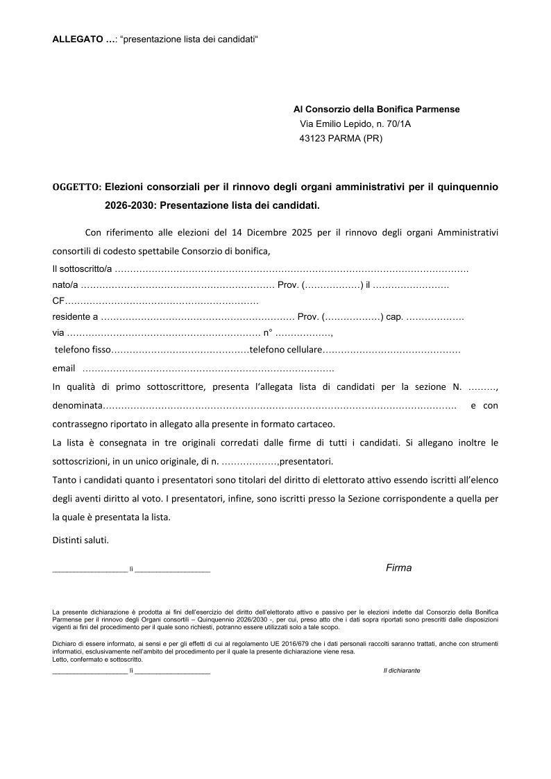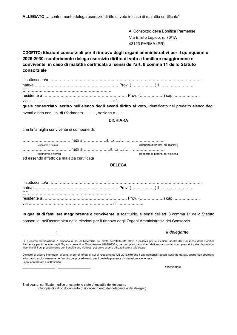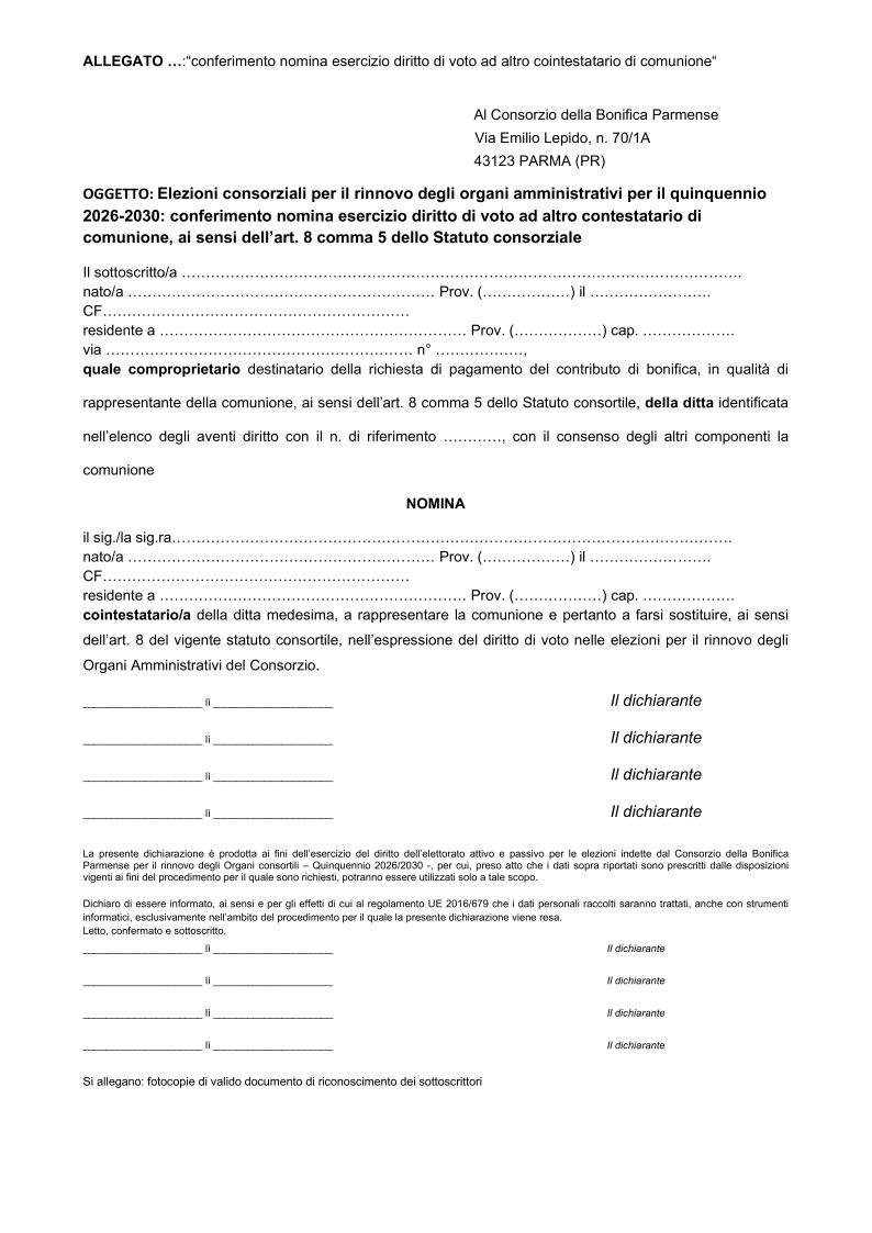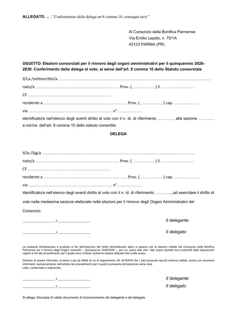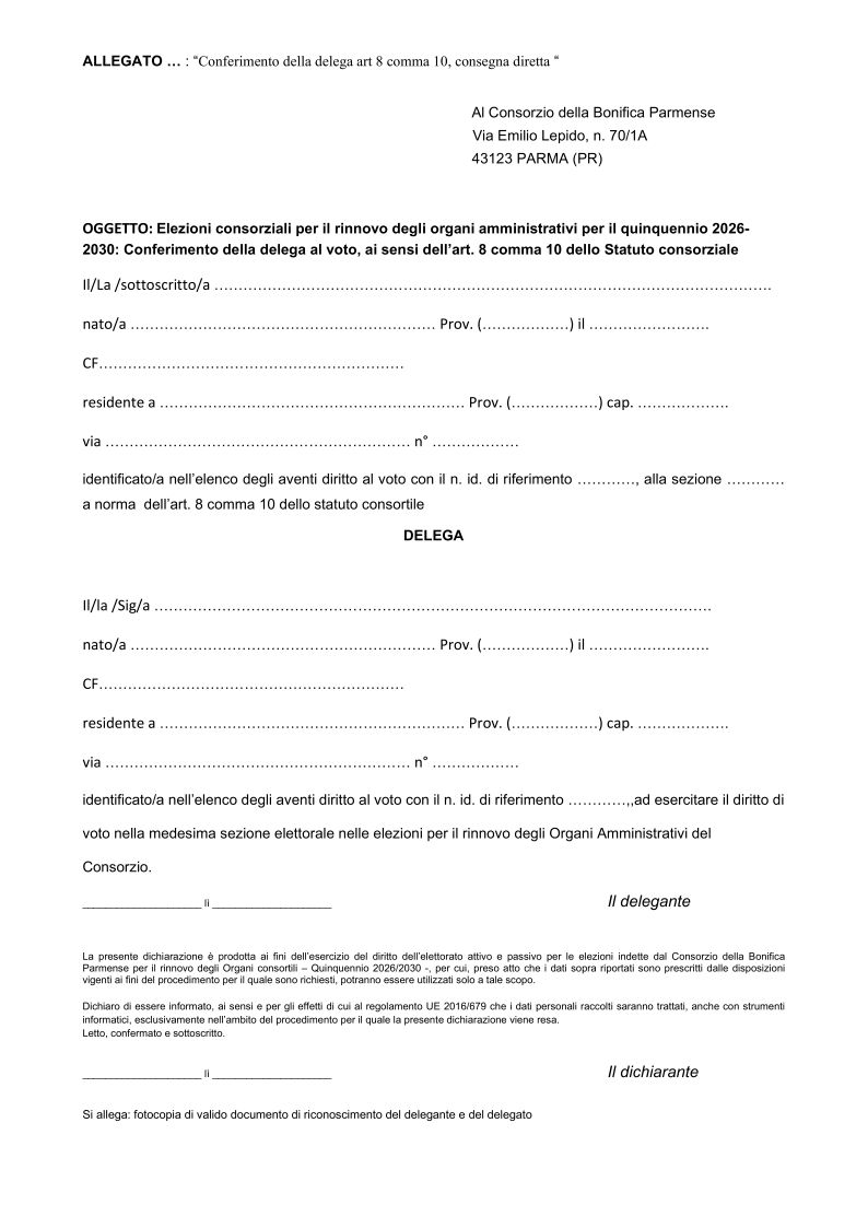 Domenica 14 dicembre 2025 dalle ore 9:00 alle ore 19:00 sono indette le elezioni per il rinnovo del consiglio di amministrazione del Consorzio della Bonifica Parmense. Sono chiamati al voto tutti i consorziati in regola con i contributi dal 2020 al 2024 scaduti e non prescritti e i rappresentanti legali che depositeranno i relativi titoli di legittimazione o autocertificheranno il proprio stato secondo le indicazioni presenti nelle “Disposizioni attuative per lo svolgimento delle operazioni elettorali”.